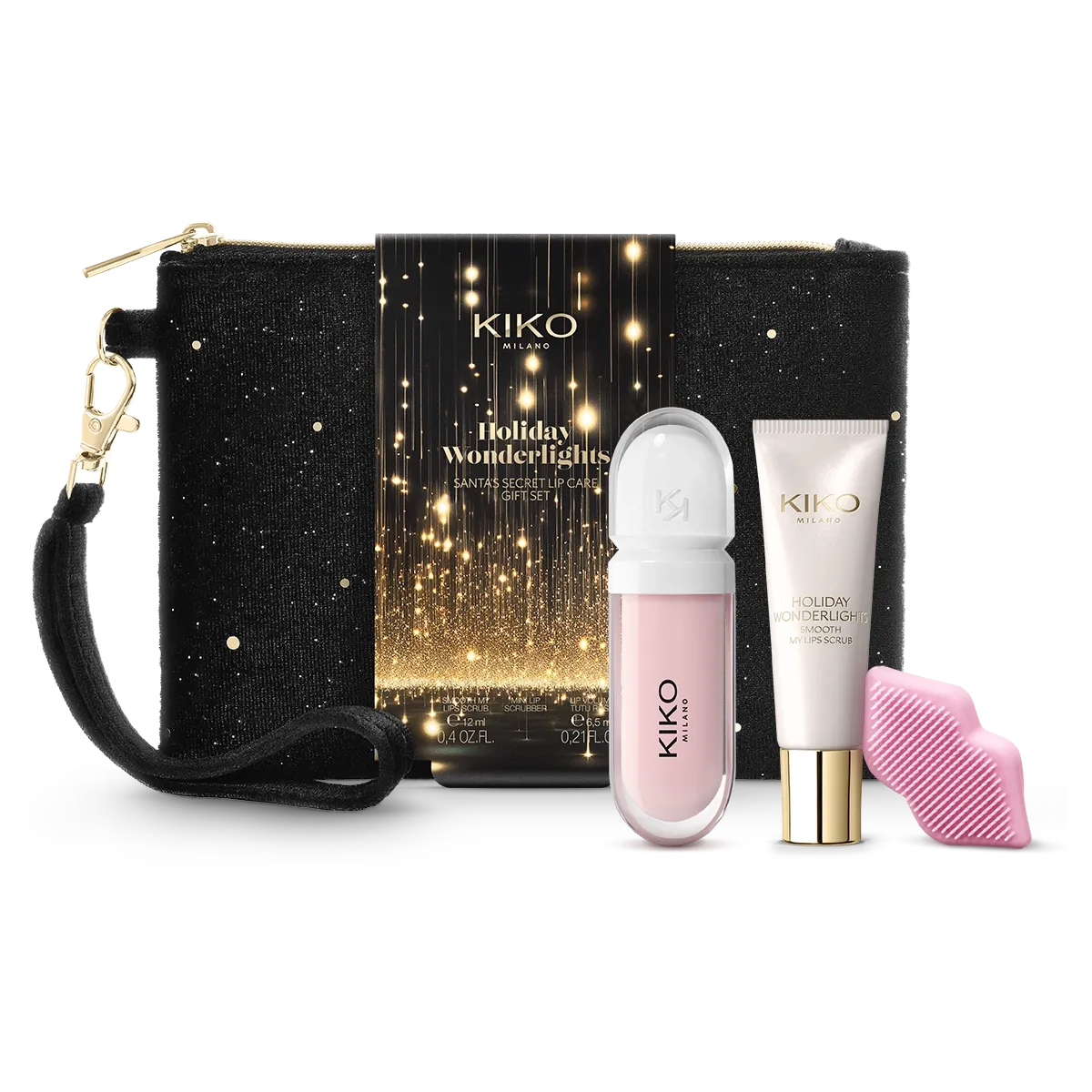 Conjunto de presente de cuidados para os lábios composto por um esfoliante para os lábios. um aplicador e um creme aperfeiçoador labial com efeito volumizador. dentro de uma mini pochete requintada.