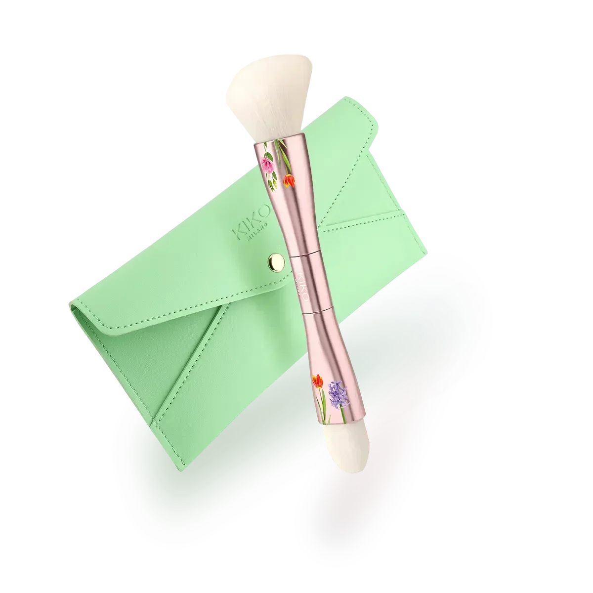 Conjunto composto por uma pochete e um pincel multiusos 4 em 1: dois pincéis interiores para aplicar e esbater pós de olhos. dois pincéis exteriores para aplicar produtos para o rosto em pó e em creme.