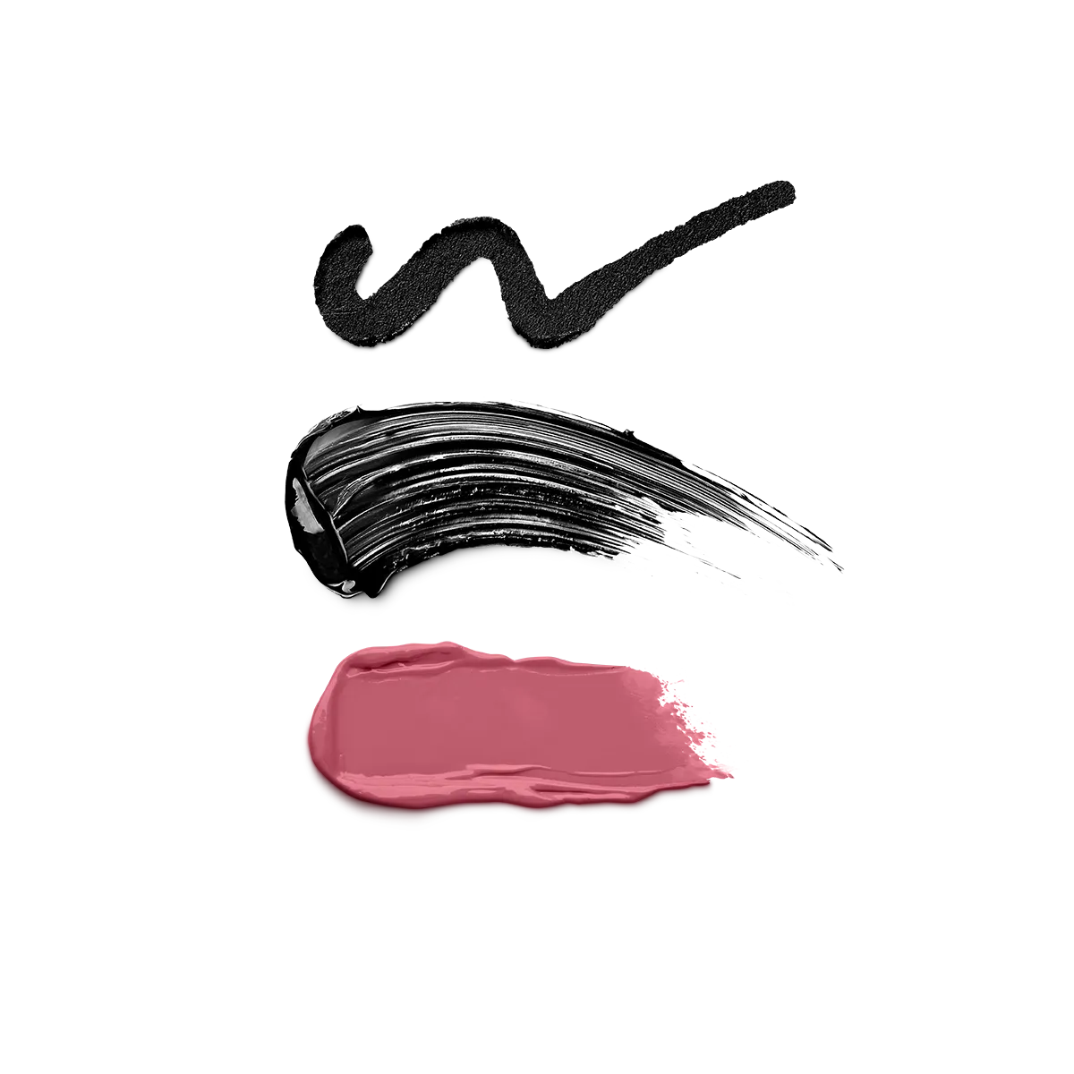Conjunto de maquiagem para presente composto por uma máscara com efeito volumizador. um lápis de olho preto. um batom e um blush líquido em formato mini. dentro de uma requintada pochete.